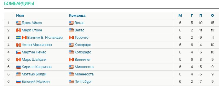Айкел набрал 0+4 в матче с «Калгари», Стоун – 2+2. Форварды «Вегаса» идут на 1-м и 2-м местах в гонке бомбардиров НХЛ с 15 и 13 очками после 6 игр