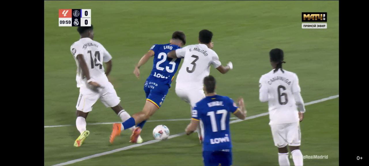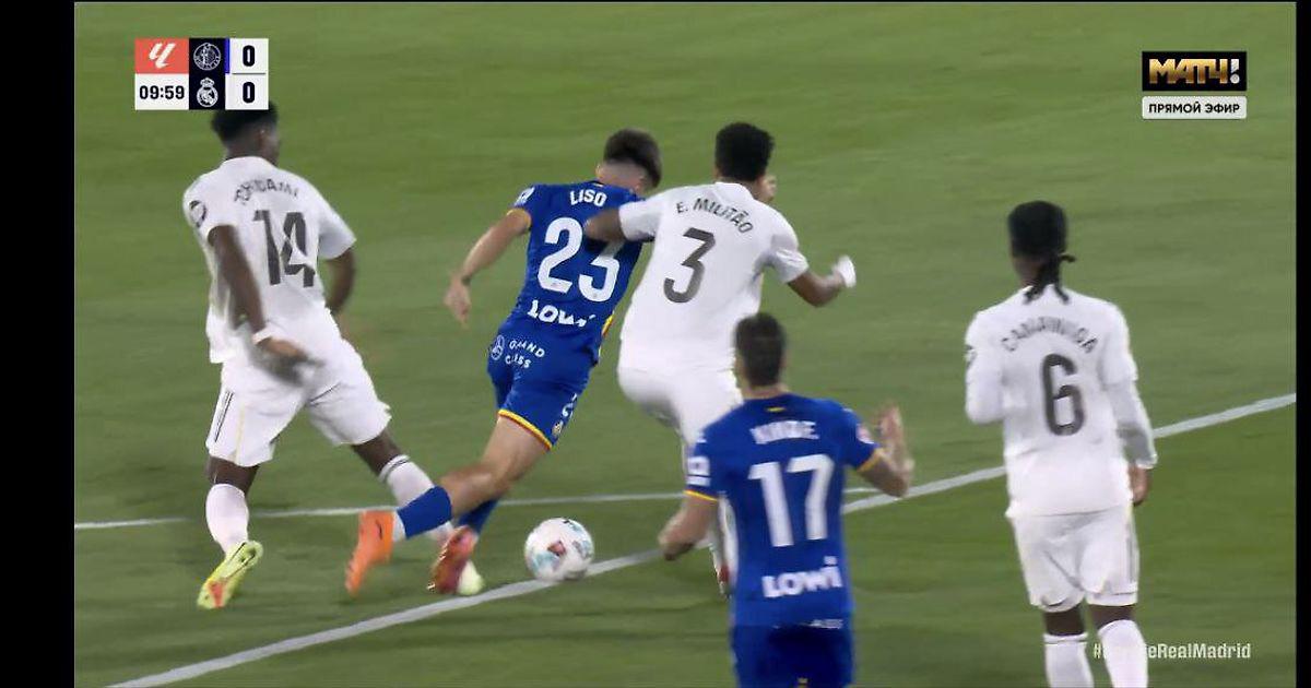 На 5-й минуте нападающий «Хетафе» Адриан Лисо упал в штрафной «Реала» после контакта с ногой Орельена Тчуамени. Судья Хосе Мунуэра Монтеро не зафиксировал нарушения правил, ВАР не отреагировал.