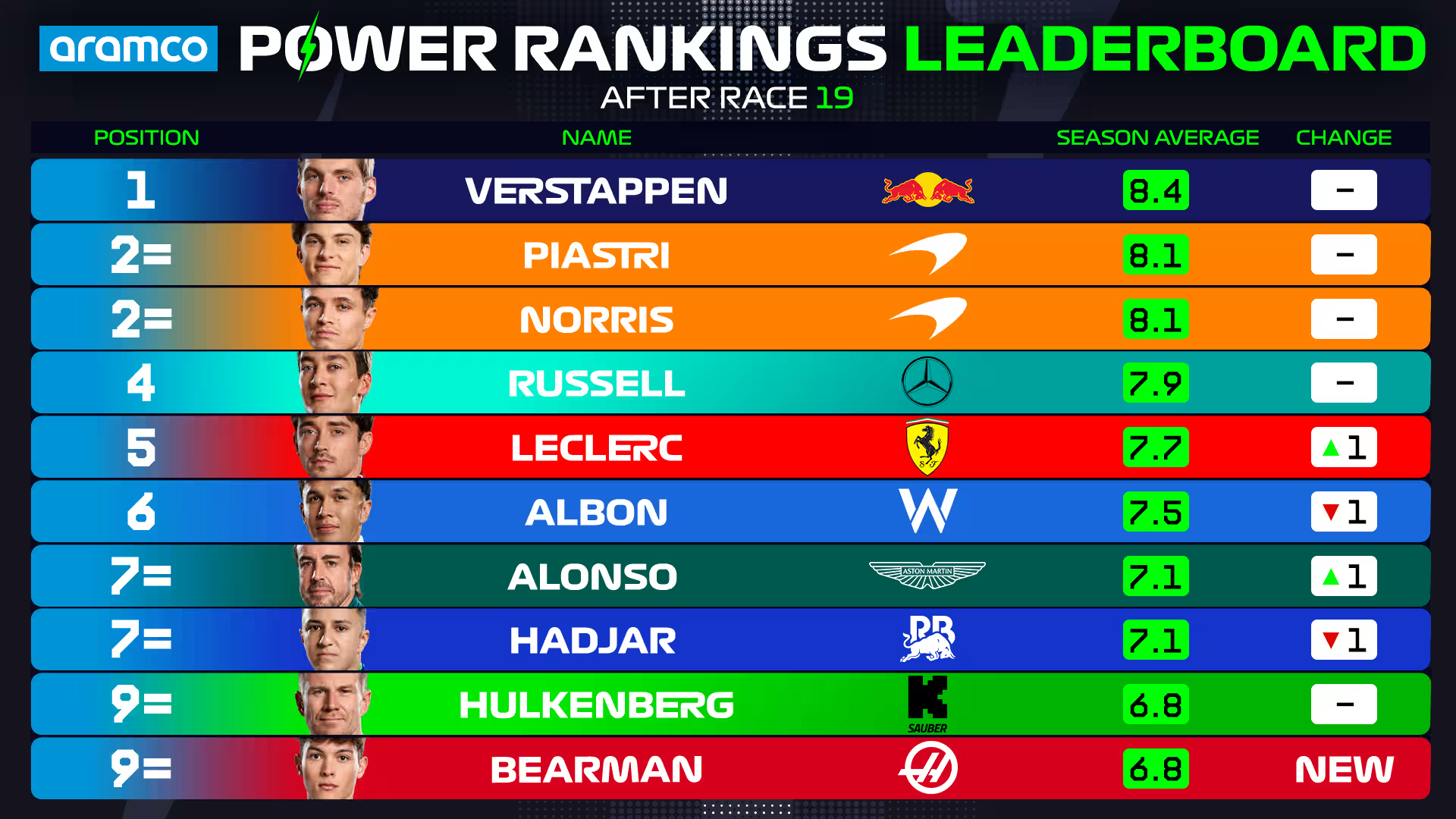 После этапа в Остине победитель гонки и спринта Макс Ферстаппен («Ред Булл») получил высшую оценку – 10. Вторым стал Шарль Леклер из «Феррари», финишировавший третьим в воскресной гонке, – у него 8,6 балла. Тройку замкнули Ландо Норрис («Макларен») и Оливер Бермэн («Хаас») – у обоих 8,2.