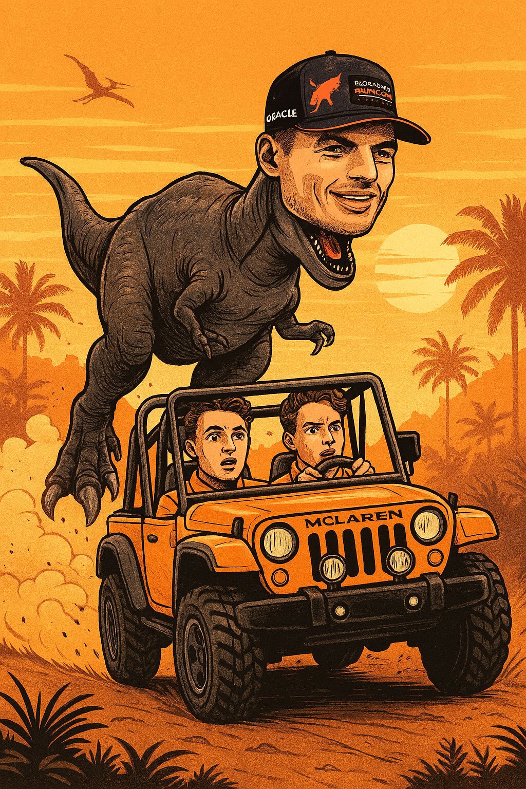 Дэвид Крофт показал картинку с Ферстаппеном-тираннозавром: «Норрис и Пиастри пытаются спастись на джипе, и, похоже, у «Макларена» не получается ускориться»