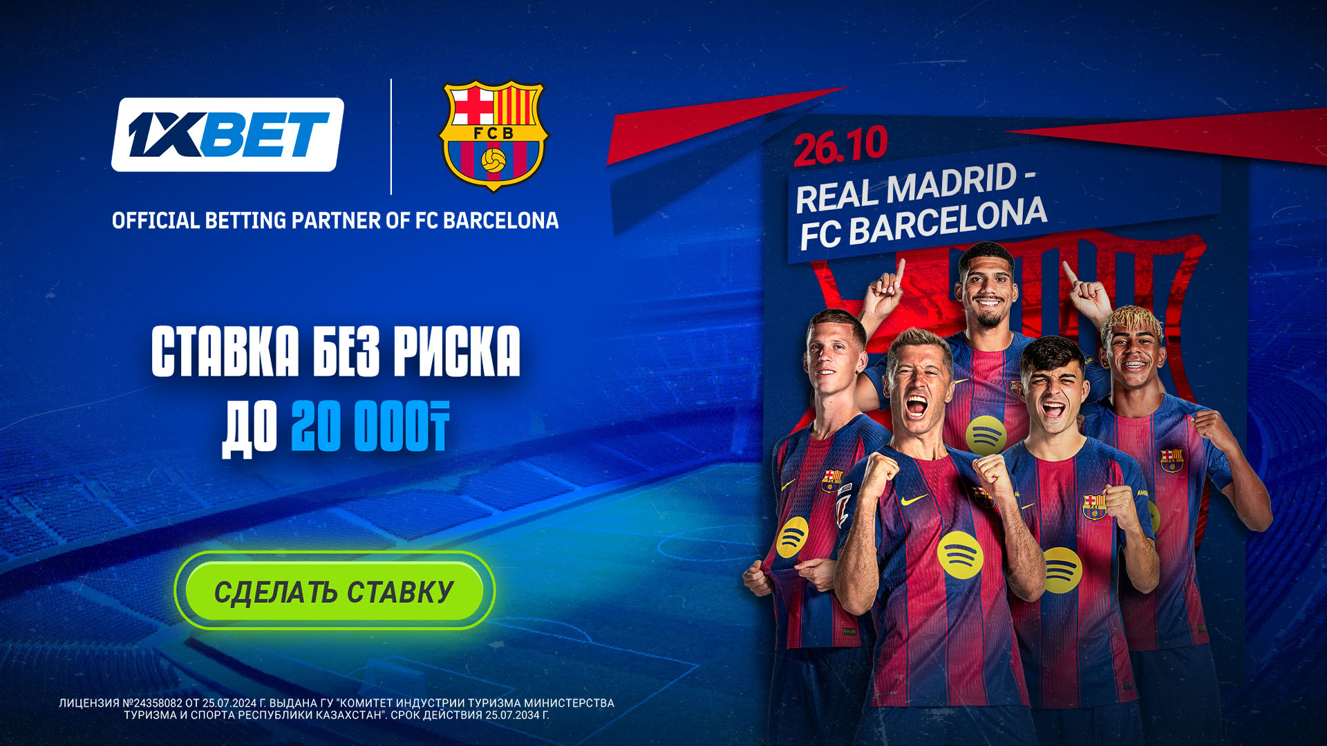 Если участник сделает несколько ставок на одно акционное событие, то только первое из них будет считаться как «СТАВКА БЕЗ РИСКА». То есть, если первая ставка проиграет, вы получите сумму возврата в виде промокода, равной сумме проигранной ставки, но не более 20 000 тенге. В случае если первая ставка на акционное событие выиграет, бонус не будет начислен.