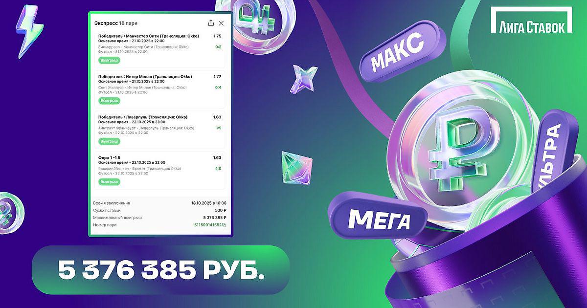 Пользователь «Лиги Ставок» собрал экспресс из 18 матчей, в который вошли матчи Лиги чемпионов и европейских чемпионатов. Он поставил 500 рублей на огромный коэффициент 10 752 и выиграл 5 376 385 рублей.