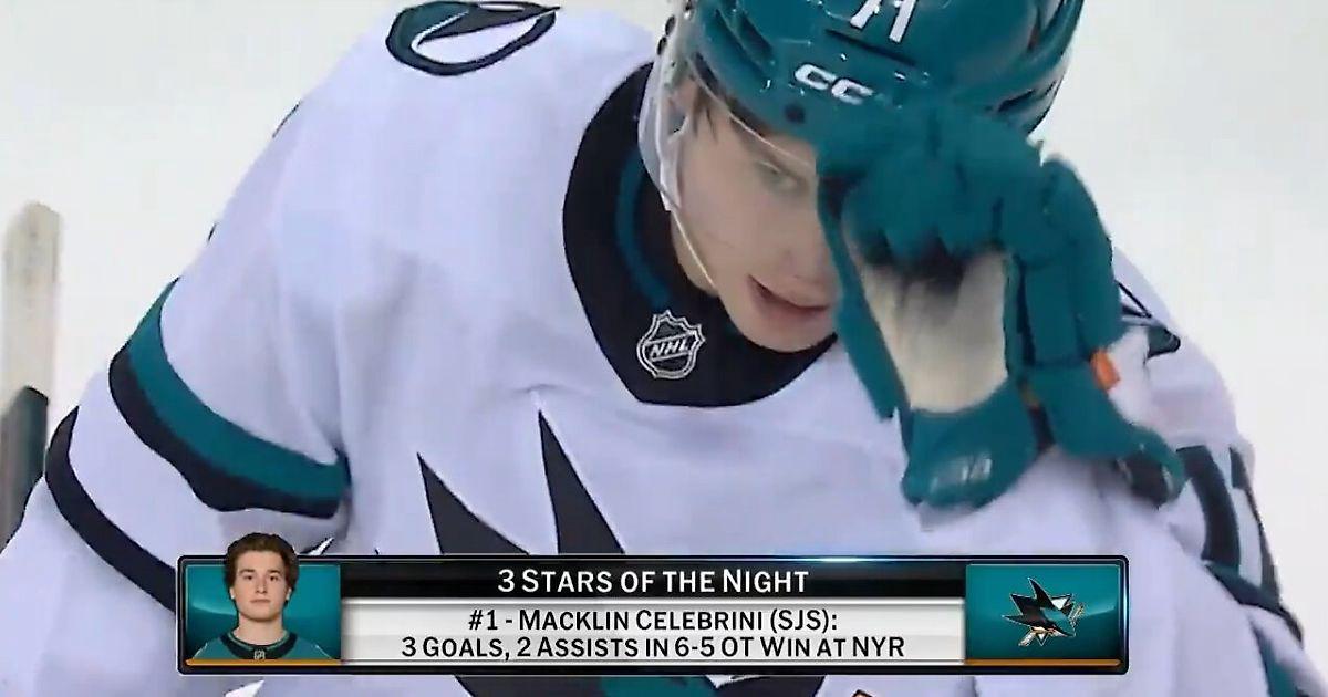 Первая звезда – форвард «Сан-Хосе» Макклин Селебрини с 5 (3+2) очками в игре с «Рейнджерс» (6:5 ОТ). Хет-трик и матч с 5 очками стали для первого номера драфта-2024 вторыми в карьере.