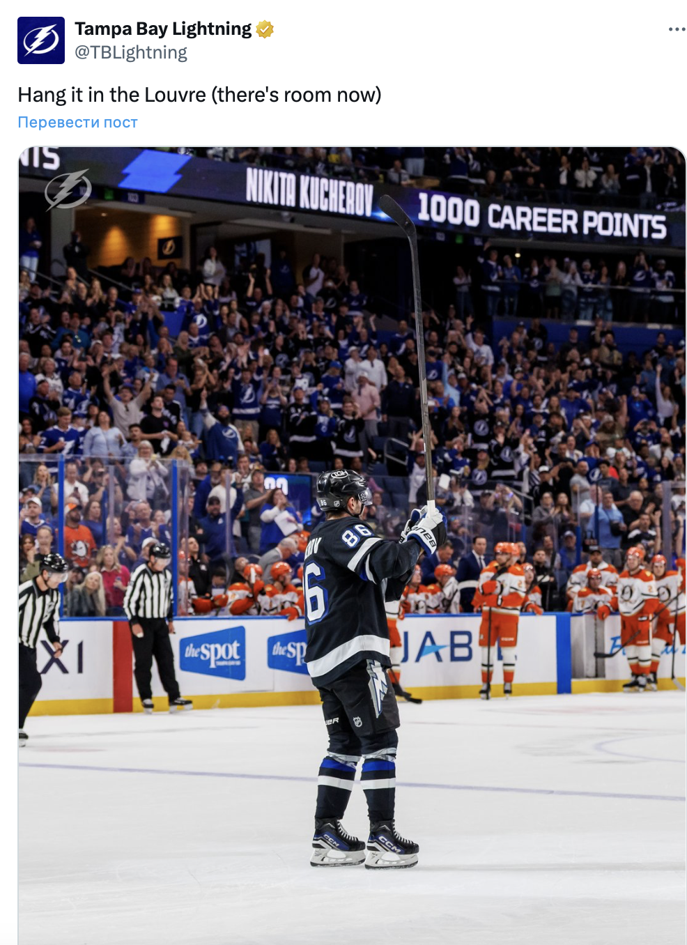 «Тампа» выложила фото Кучерова, набравшего 1000-е очко в НХЛ: «Повесьте это в Лувре, теперь там есть место»