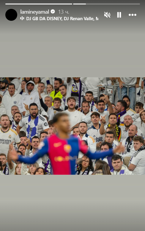 18-летний вингер каталонцев опубликовал в сторис инстаграма свою размытую фотографию с разведенными в стороны руками на фоне трибуны с недовольными болельщиками «Реала».