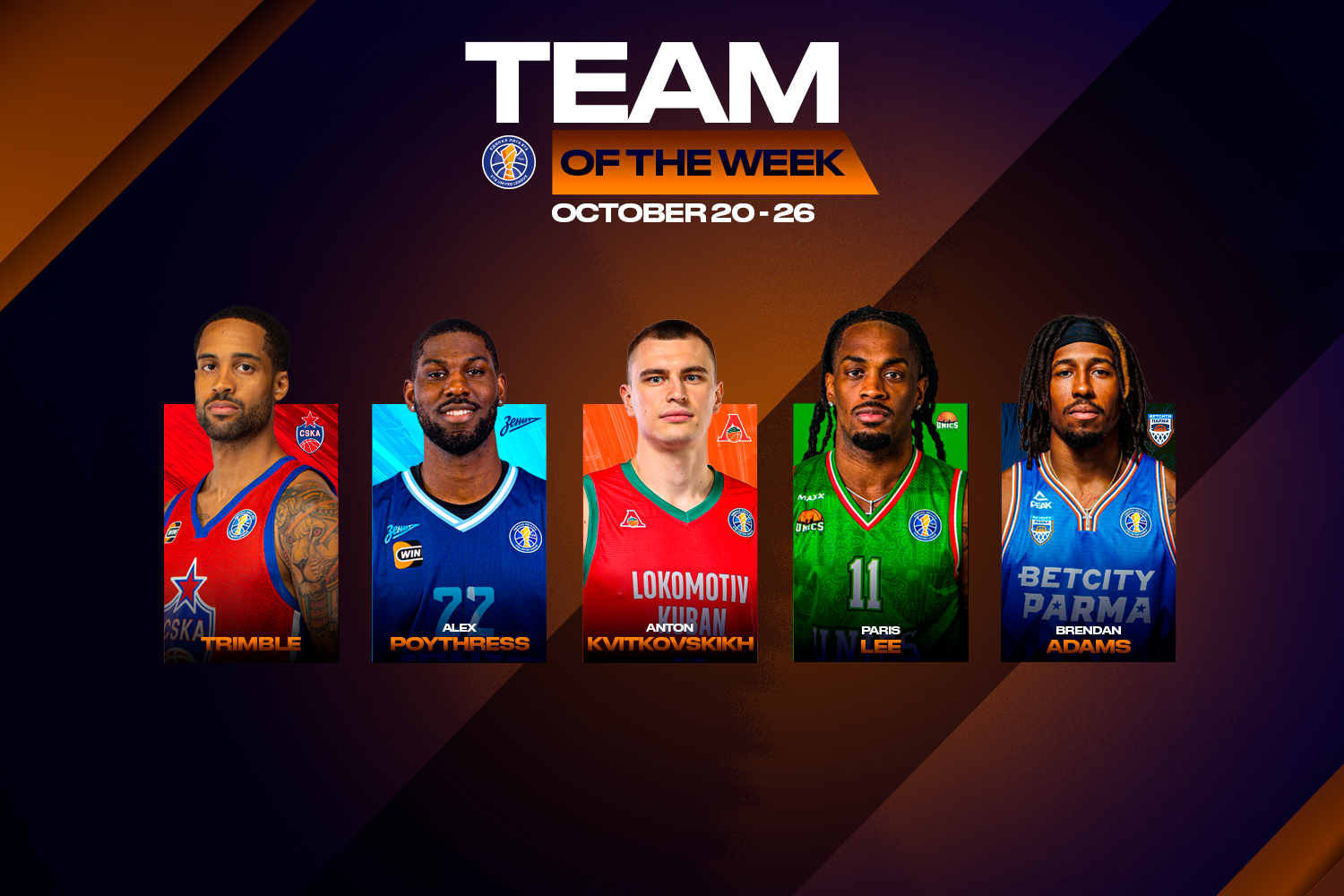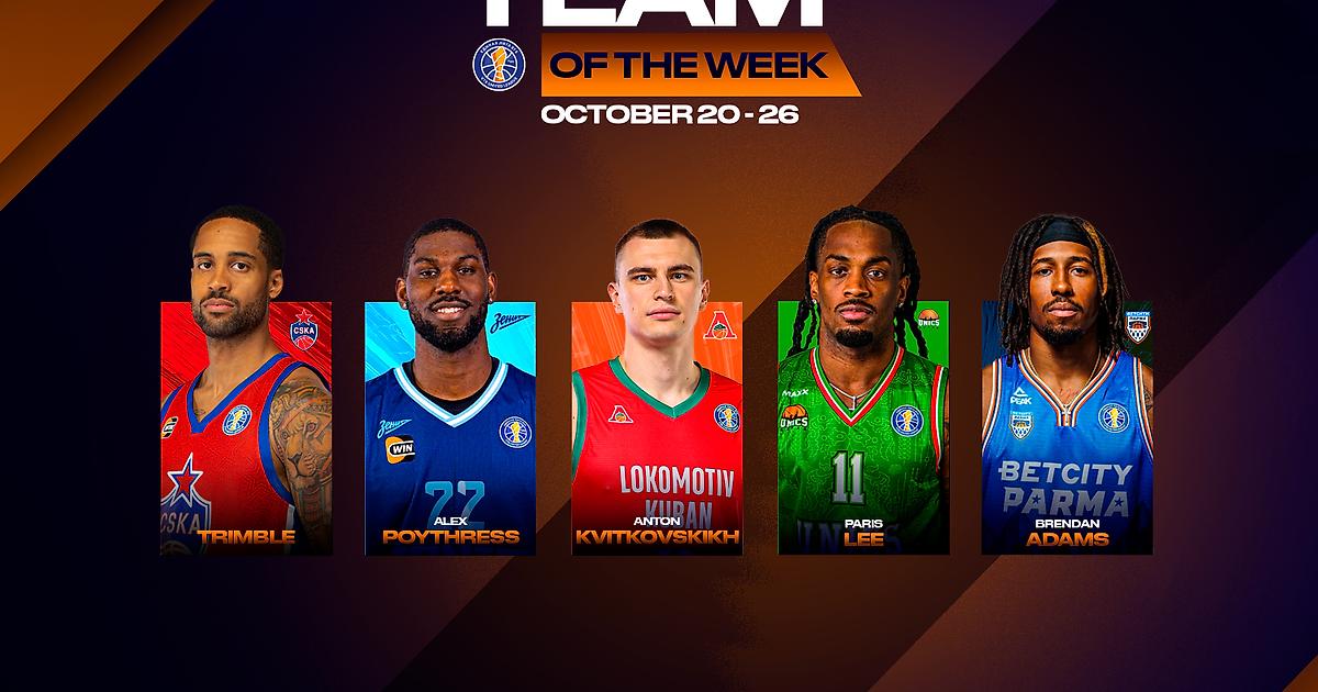 По итогам матчей 20-26 октября в символическую пятерку вошли разыгрывающие Мело Тримбл (ЦСКА), Брендан Адамс («БЕТСИТИ ПАРМА») и Пэрис Ли (УНИКС), форвард Антон Квитковских («Локомотив-Кубань») и центровой Алекс Пойтресс («Зенит»).
