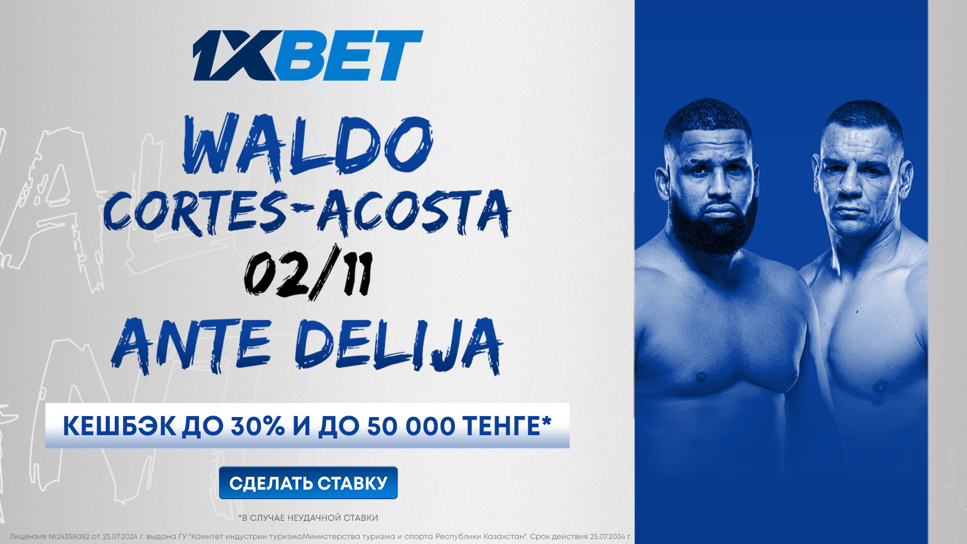 Компания 1XBET предлагает поддержать своего фаворита и получить до 50 000 тенге и кэшбэк до 30% в случае проигрыша.