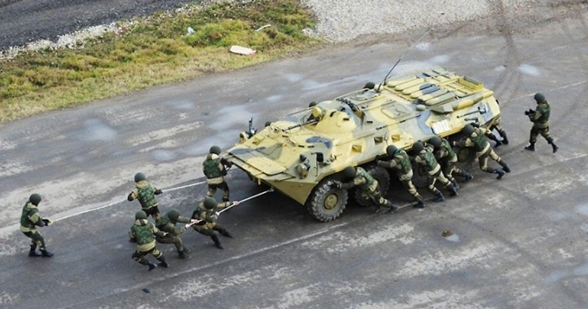 Самым сложным же физически было толкать БТР. Его непросто сдвинуть с места, плюс это все делается одним действием, а не так, что кто хочет, тот и толкает. Опять же смысл в том, что нужно действовать командой, сообща.