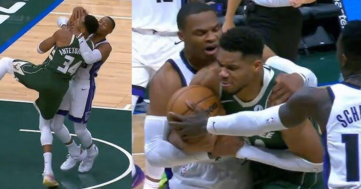 Расселл Уэстбрук остановил Янниса Адетокумбо под кольцом, повиснув на нем