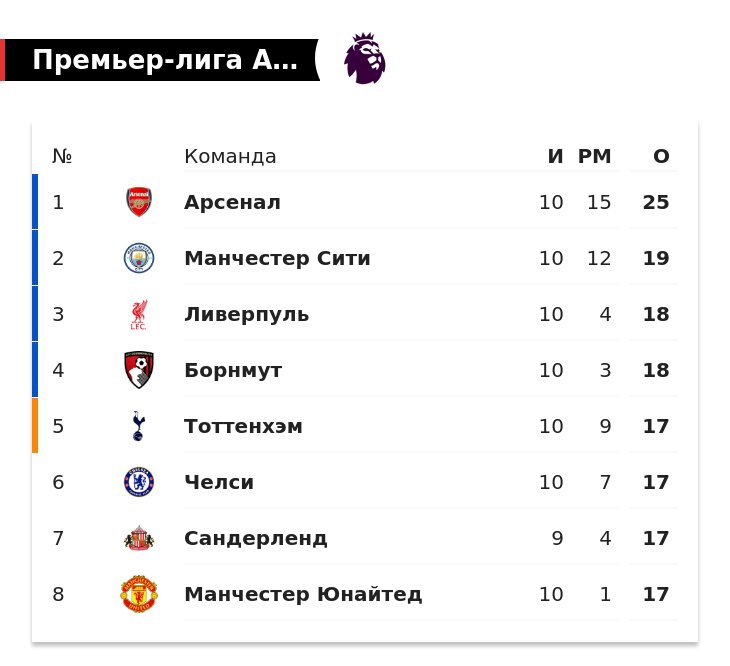 «Арсенал» лидирует в АПЛ после 10-го тура. «Сити» отстает на 6 очков, «Ливерпуль» и «Борнмут» – на 7, «Челси» – 6-й, «МЮ» – 8-й, «Сандерленд» сыграет в понедельник