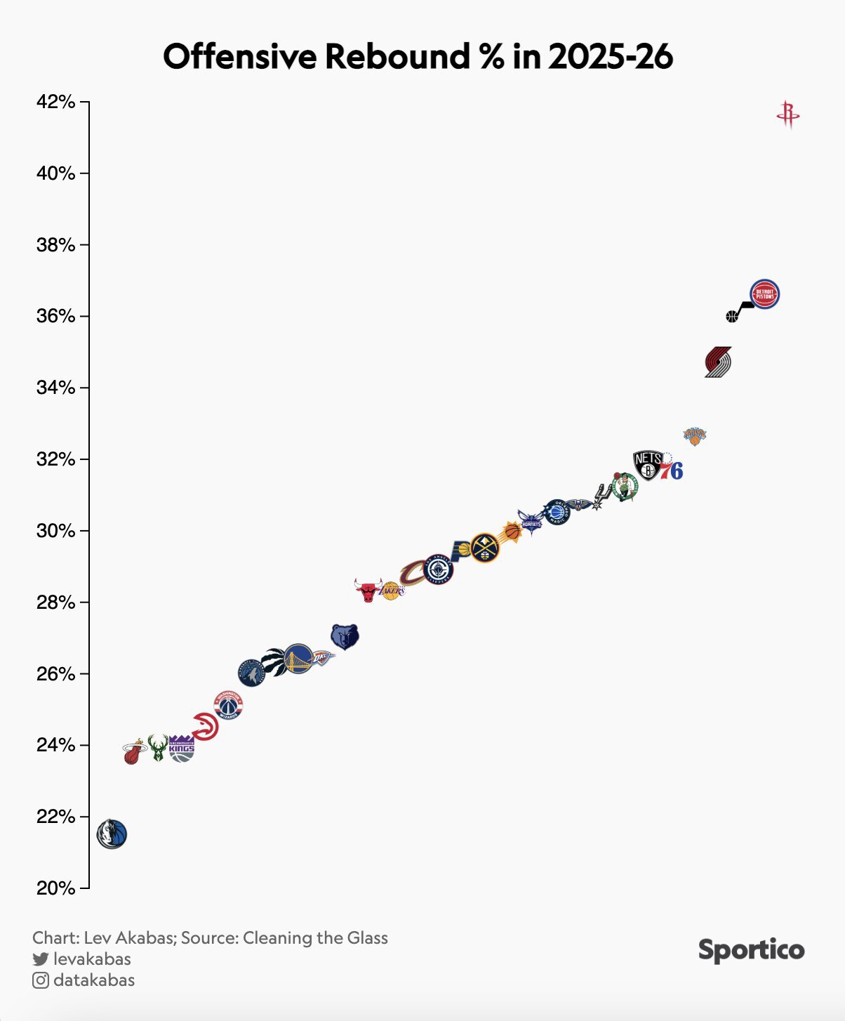 Как сообщает аналитик Лев Акабас, команда возвращает 42% своих промахов – это самый высокий показатель в НБА на текущий момент.