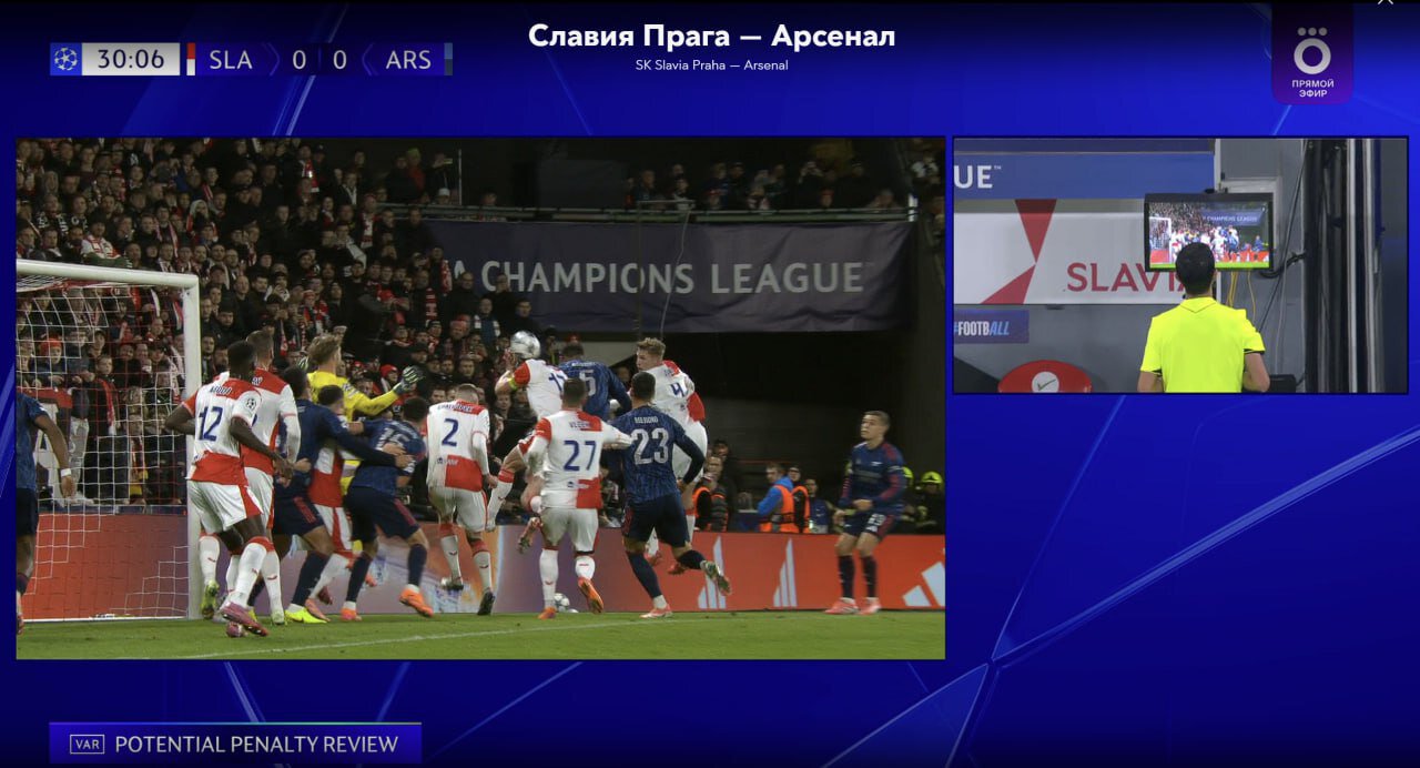 Судьи назначили пенальти в пользу «Арсенала» в матче против «Славии» в 4-м туре общего этапа Лиги чемпионов.