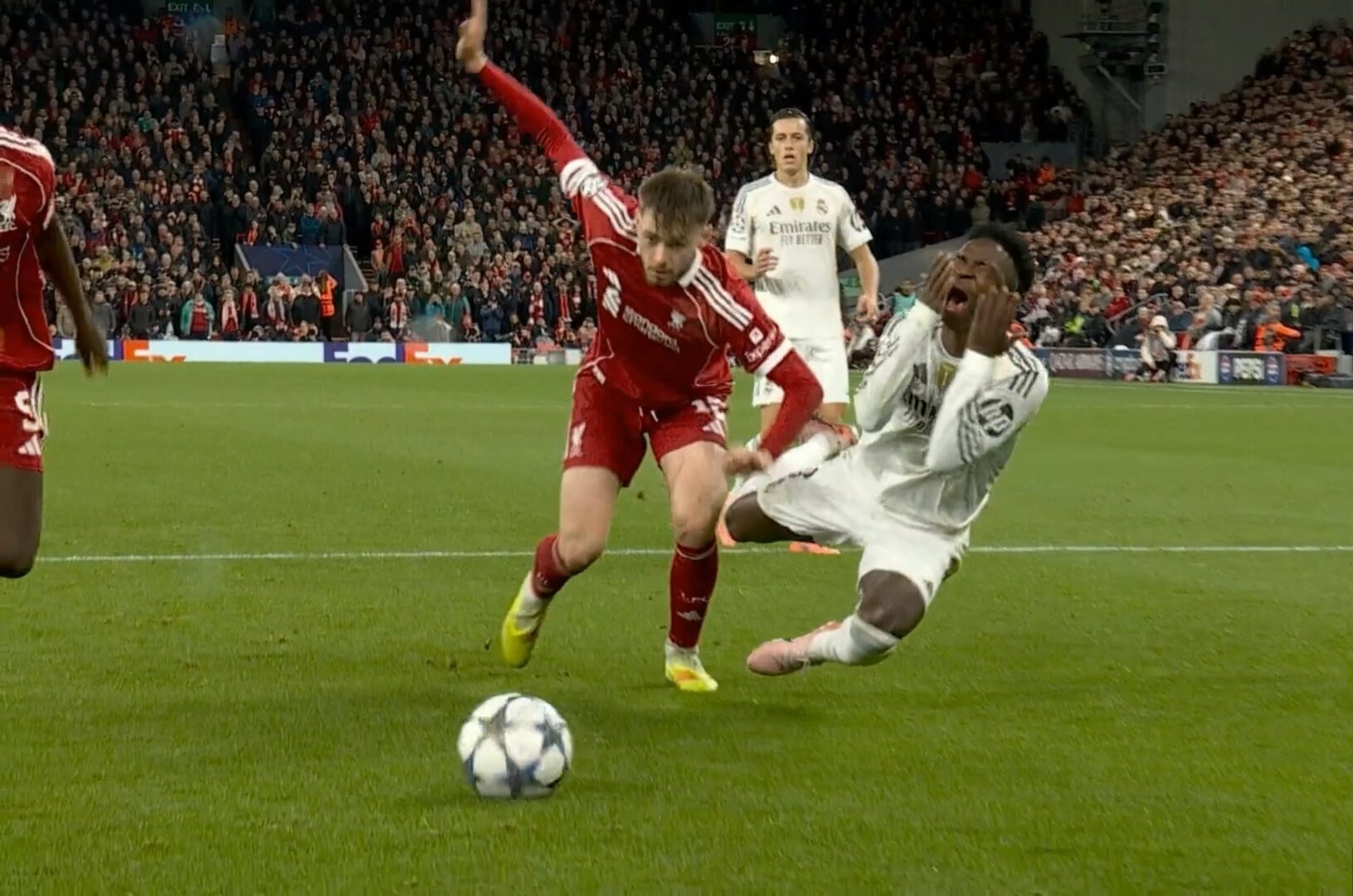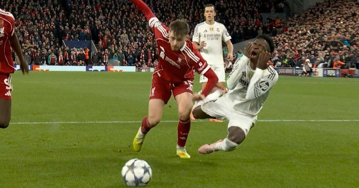 Винисиус Жуниор претендовал на пенальти в конце первого тайма матча Лиги чемпионов с «Ливерпулем».