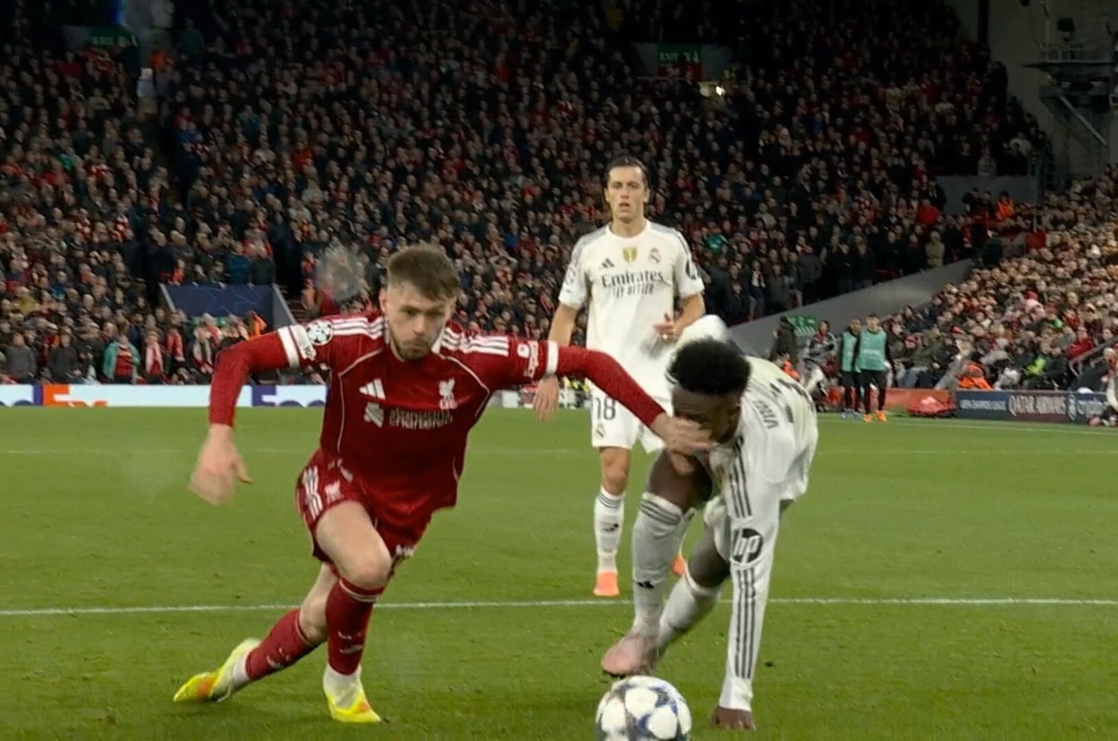 Брэдли ладонью задел нос Винисиуса в штрафной «Ливерпуля» – бразилец вскрикнул и упал, закрыв лицо руками. Судья Ковач не отреагировал