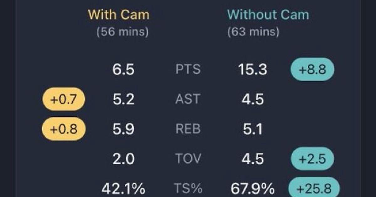 Игра без Кэма Томаса в 2 с лишним раза увеличивает его результативность и повышает атакующую эффективность. Процент задействования также увеличивается с 11 до 18.
