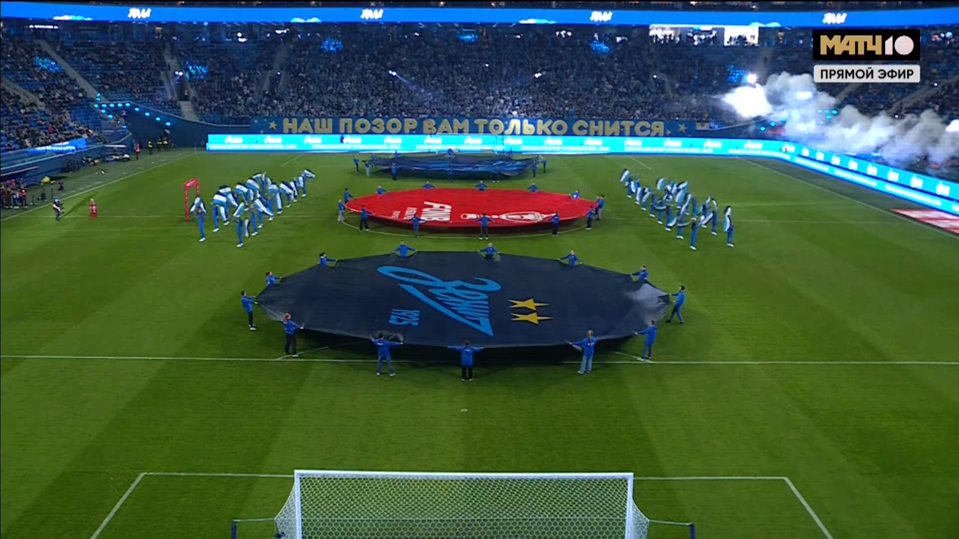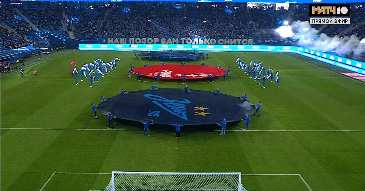 Фанаты петербуржцев перед игрой растянули на трибуне большое полотно, на котором написано: «Наш позор вам только снится». Также в какой-то момент за ним появилось изображение спящего с соской во рту человека, видящего во сне трофеи «Зенита».