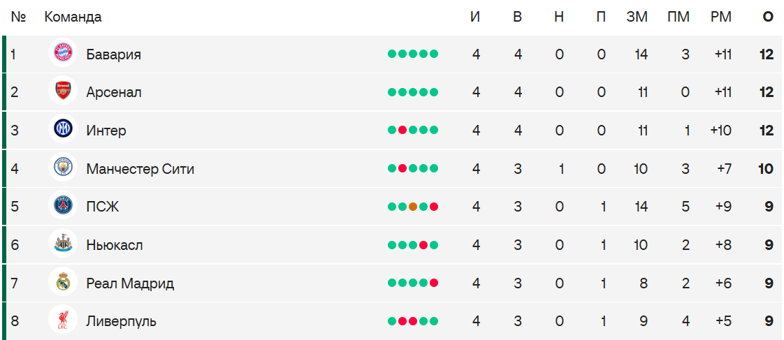 «Бавария» лидирует в ЛЧ после 4-го тура, «Арсенал» – 2-й, «Интер» – 3-й, «Ман Сити» – 4-й, «Реал» – 7-й, «Ливерпуль» – 8-й, «Барса» – 11-я, «Карабах» – 15-й, «Ювентус» – вне зоны плей-офф