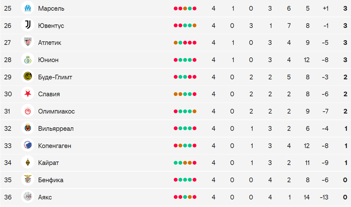 «Ювентус» (3 очка) и «Кайрат» (1 очко) – в числе команд, идущих вне зоны плей-офф. Ни одного балла не набрали лишь «Бенфика» и «Аякс» – 35-е и 36-е места.