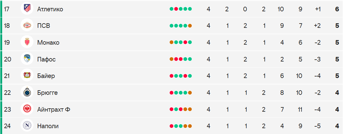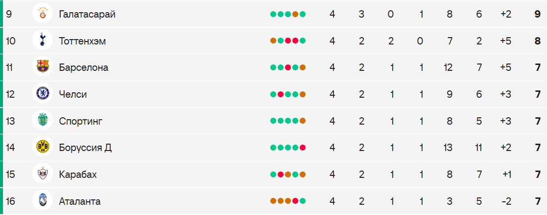 «Манчестер Сити» с 10 очками идет на 4-м месте, следом идут «ПСЖ», «Ньюкасл», «Реал», «Ливерпуль» и «Галатасарай», набравшие по 9 баллов.