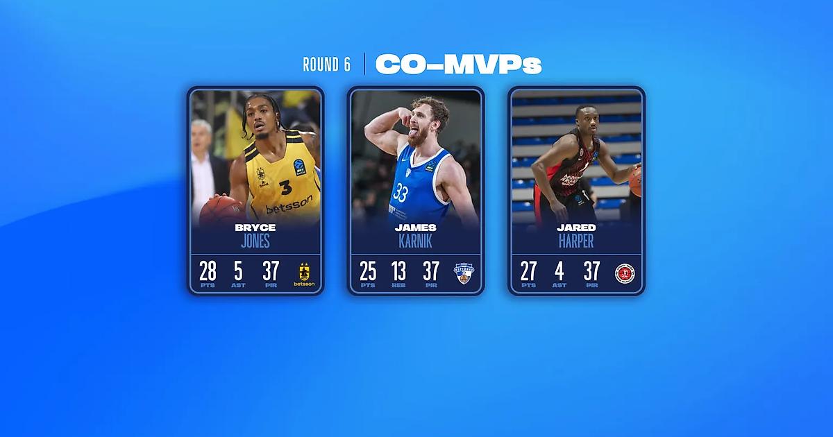 Награда самого ценного игрока 6-го тура Еврокубка досталась сразу трем баскетболистам. Брайс Джонс из «Ариса», Джаред Харпер из «Хапоэля Иерусалим» и Джеймс Карник из «Нептунаса» разделили звание MVP, отличившись яркой игрой и заметным вкладом в успех своих команд.