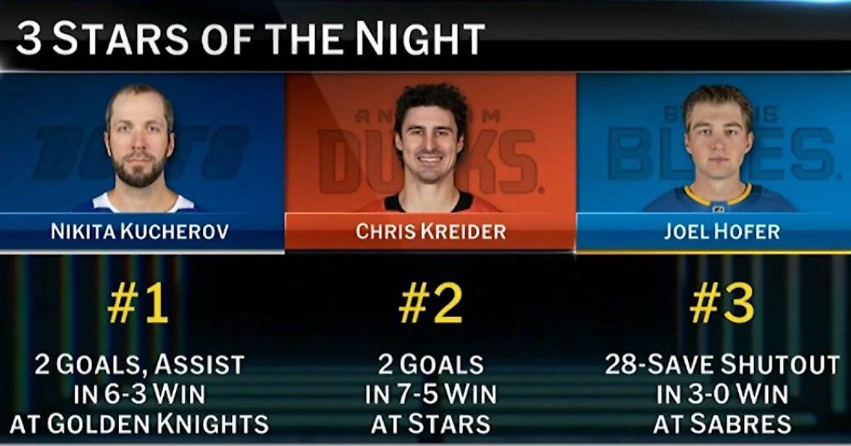 Кучеров с 2+1 стал 1-й звездой дня в НХЛ. Также в тройку вошли Крайдер с дублем и вратарь «Сент-Луиса» Хофер с шатаутом