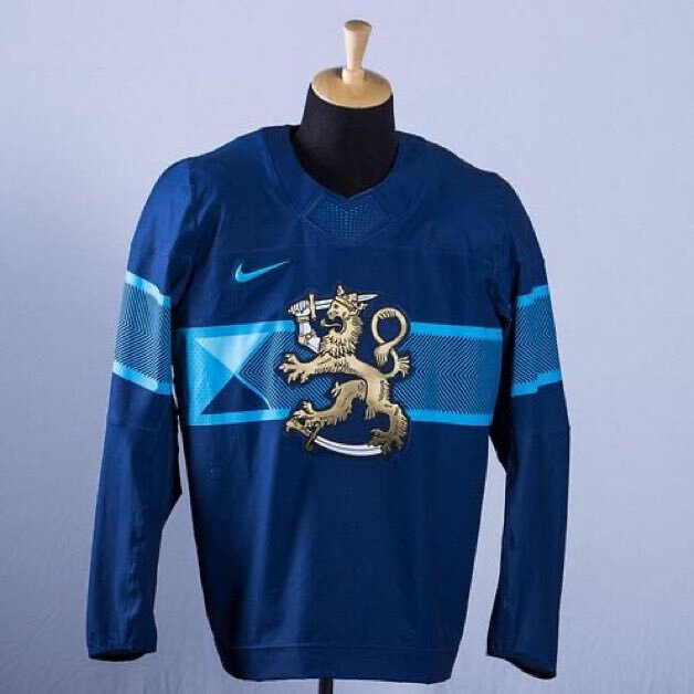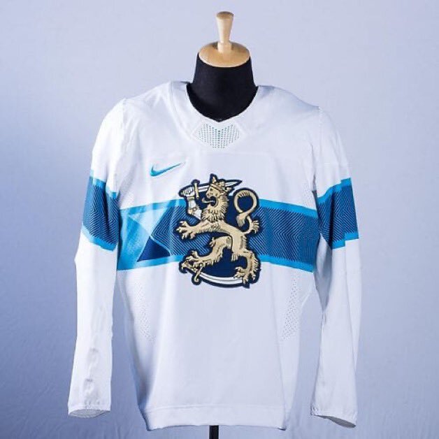 Сборная сохранила традиции: на обоих комплектах (белом и синем) в центре изображен герб Финляндии – коронованный золотой лев, его правая передняя лапа заменена рукой в доспехе, держащей серебряный меч с золотой рукоятью. Лев попирает задними лапами серебряную сарацинскую саблю с золотой рукоятью.