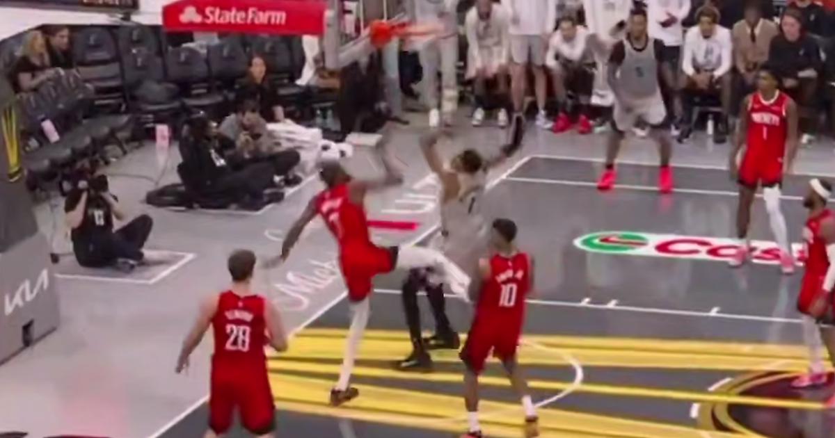 Центровой «Сан-Антонио» исполнил эффектный данк. Сразу после получения мяча в трехсекундной француз поставил сверху через звезду «Хьюстона» Кевина Дюрэнта.