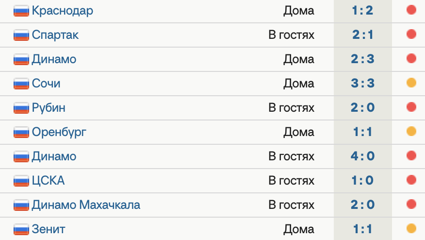 За 10 матчей было 3 ничьих и 7 поражений. Стоит отметить, что с «Сочи» в Фонбет Кубке России в основное время сыграли 3:3, но выиграли по пенальти.