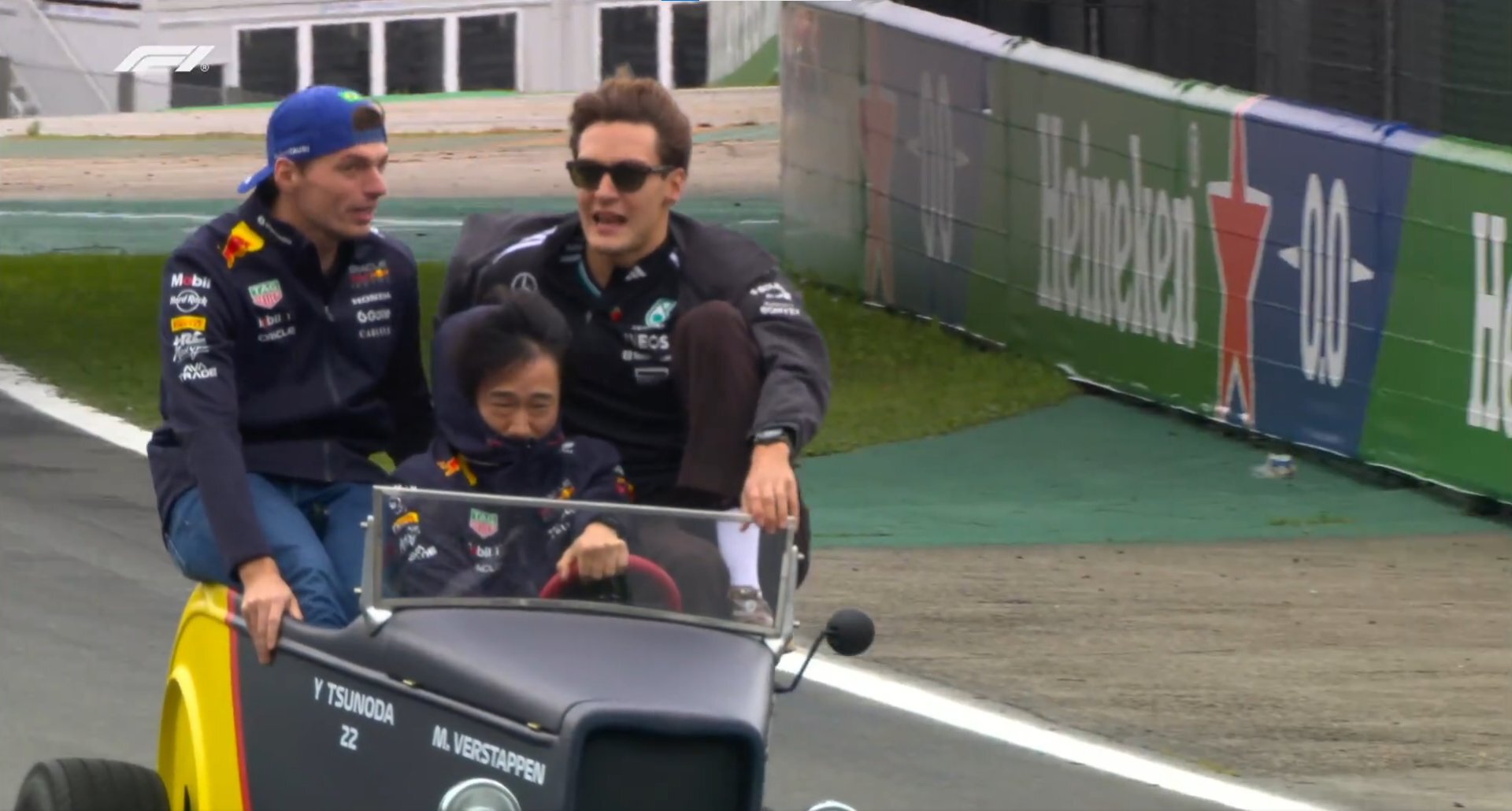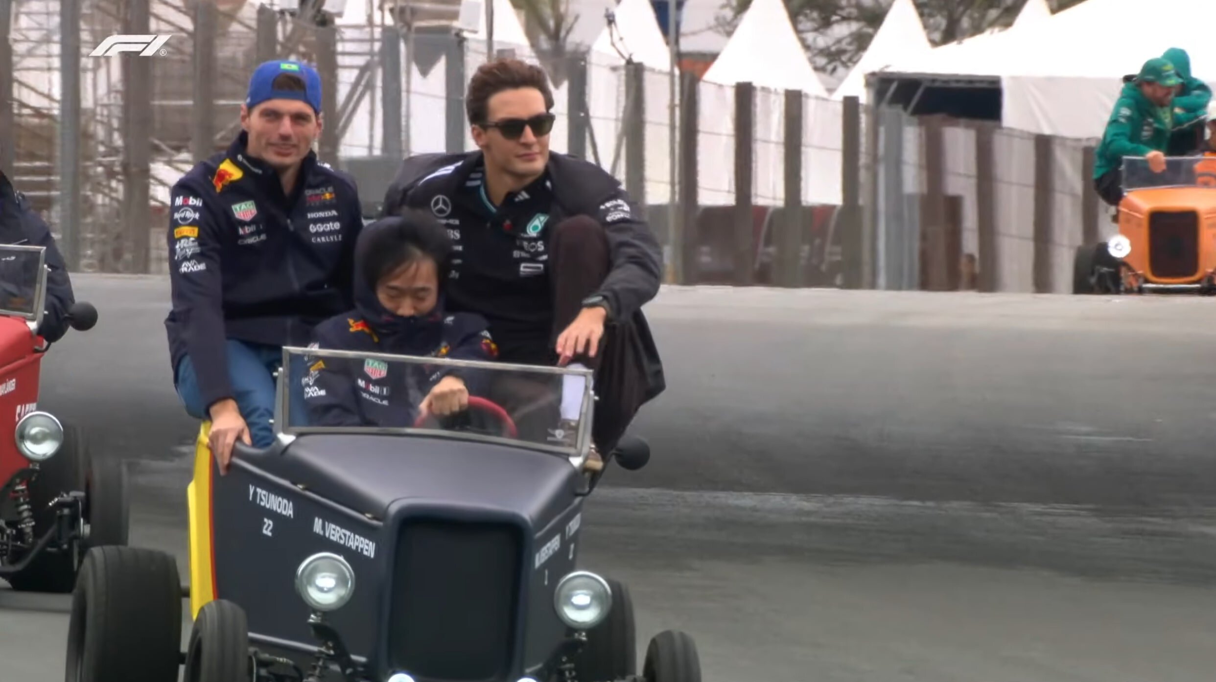 Автомобиль для гонщиков «Мерседеса» сломался, поэтому Джордж Расселл присоединился к коллегам из «Ред Булл» Максу Ферстаппену и Юки Цуноде. Три пилота уместились в машине, рассчитанной на двоих. Автомобилем управлял Цунода.