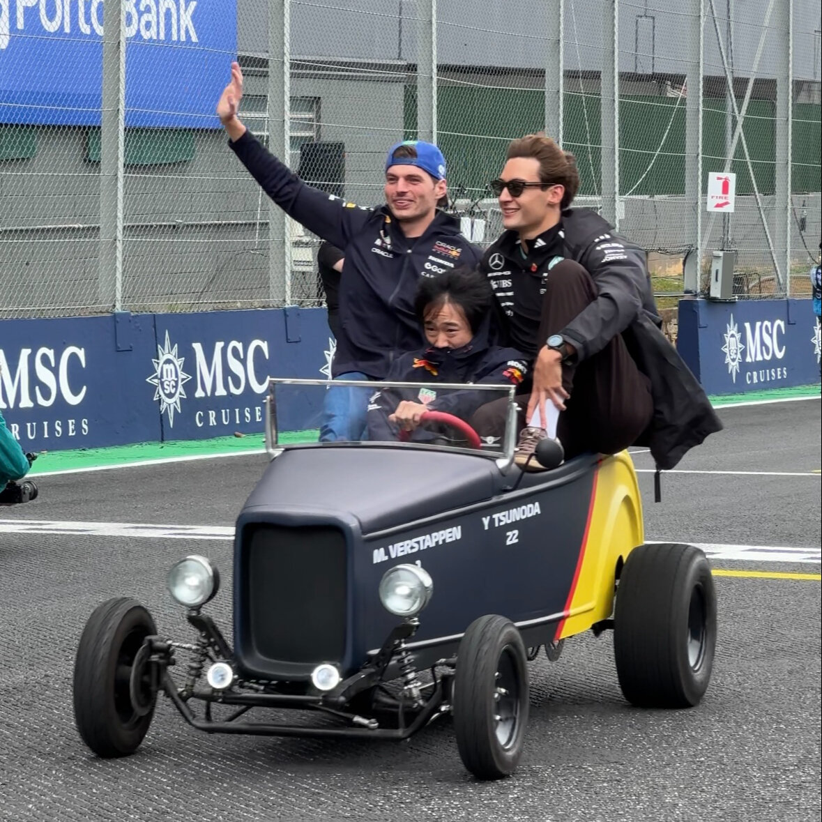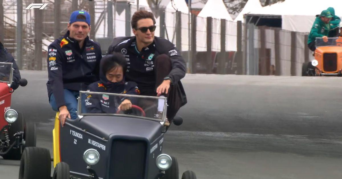 Расселл проехал с Ферстаппеном и Цунодой на параде пилотов в машине для двух пилотов