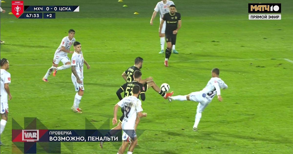Игра продолжилась, но спустя минуту главный судья Иван Сараев ее остановил, изучил видеоповтор и назначил одиннадцатиметровый. Удар с точки на 6-й добавленной минуте исполнил Ражаб Магомедов – 1:0.