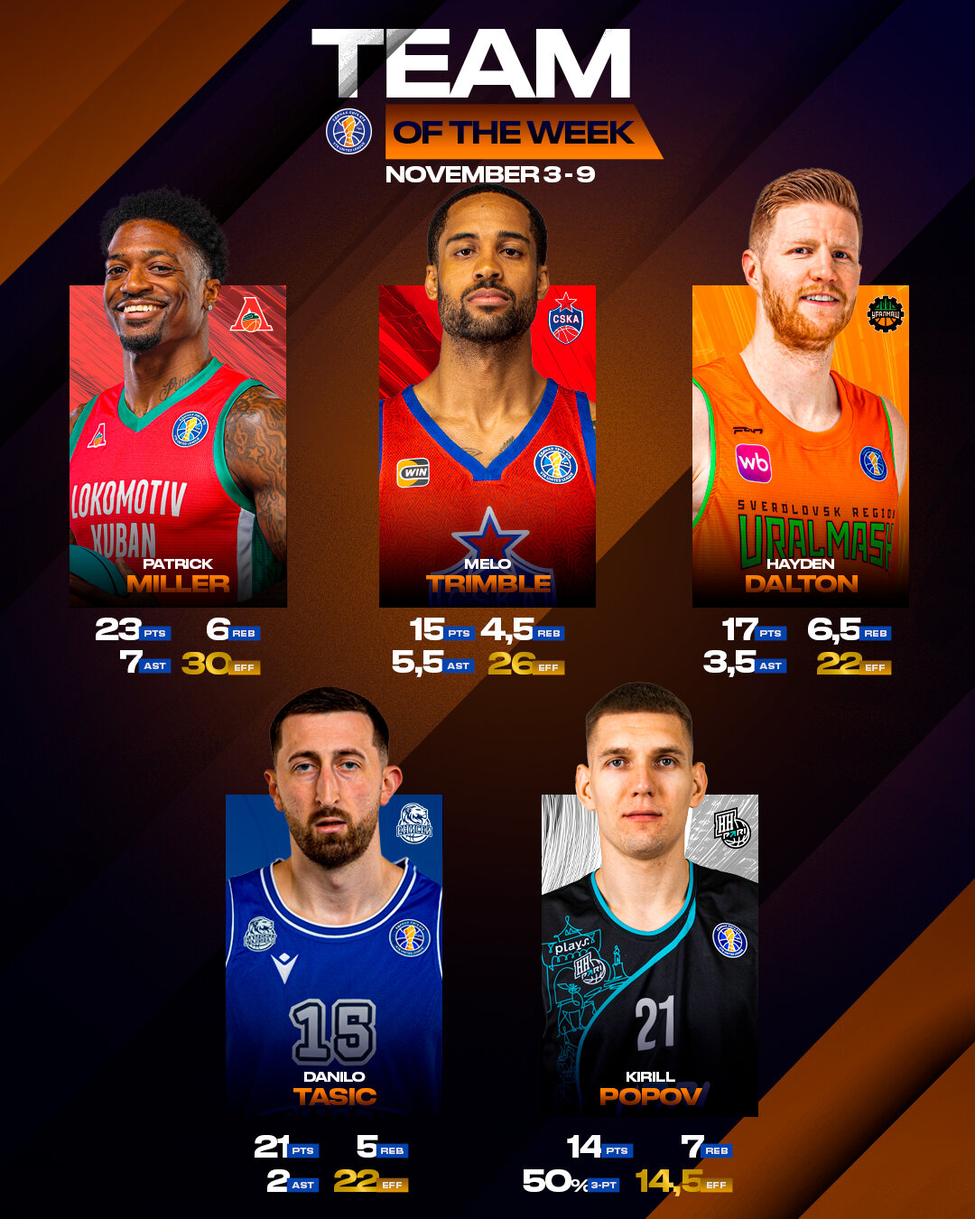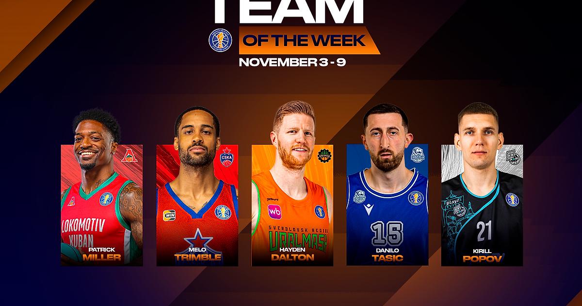 Единая лига ВТБ определила лучших игроков по итогам прошедшей игровой недели. По итогам матчей 3 – 9 ноября в символическую пятерку вошли разыгрывающие Патрик Миллер («Локомотив-Кубань») и Мело Тримбл (ЦСКА), форварды Данило Тасич («Енисей»), Хэйден Далтон («Уралмаш») и Кирилл Попов («Пари НН»).