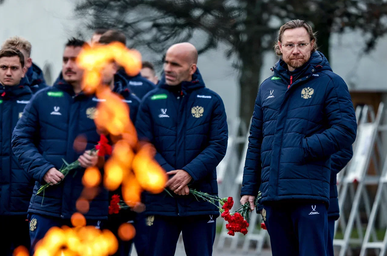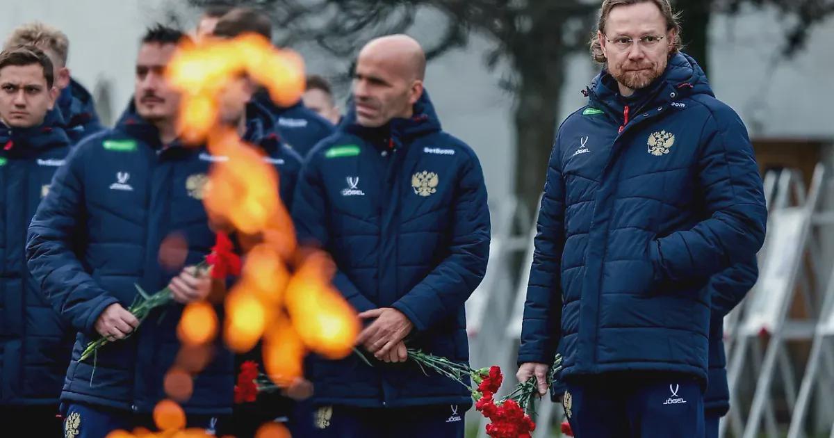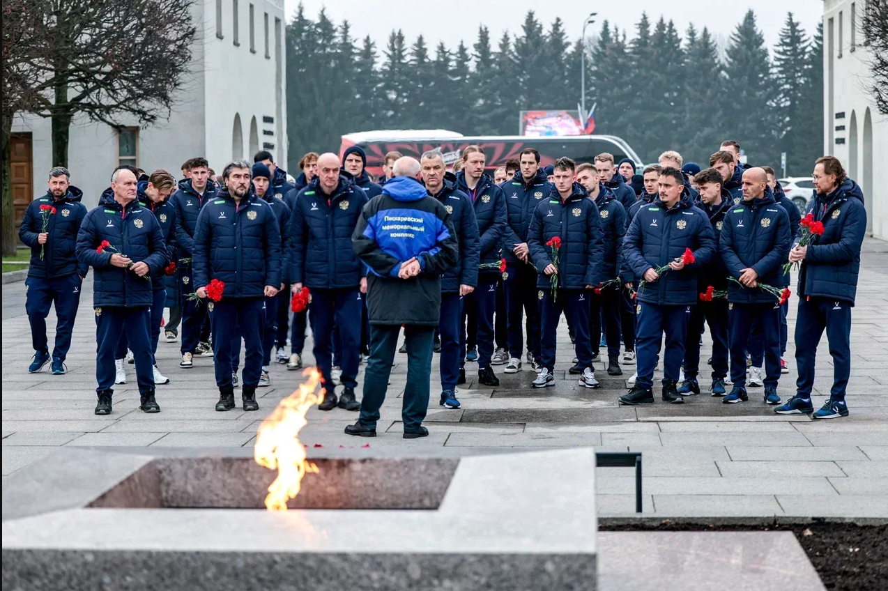 Сборная России в полном составе почтила память жертв Великой Отечественной войны на Пискаревском мемориальном кладбище в Санкт-Петербурге.