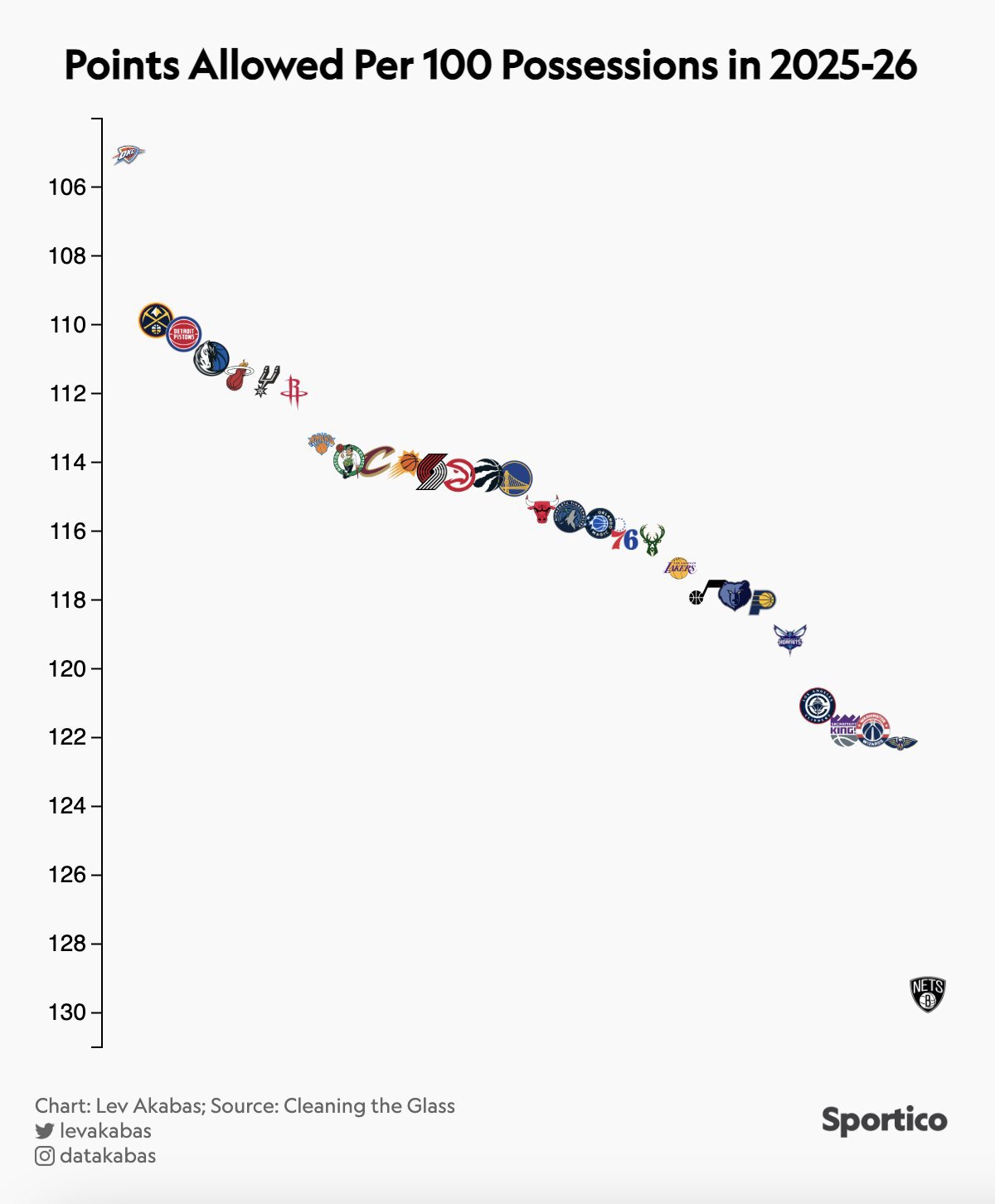 «Нетс» значительно отстают от всех остальных клубов лиги по показателям защиты. Для сравнения, рядом внизу оборонительного рейтинга расположились «Вашингтон» (121,5) и «Сакраменто» (120,9).