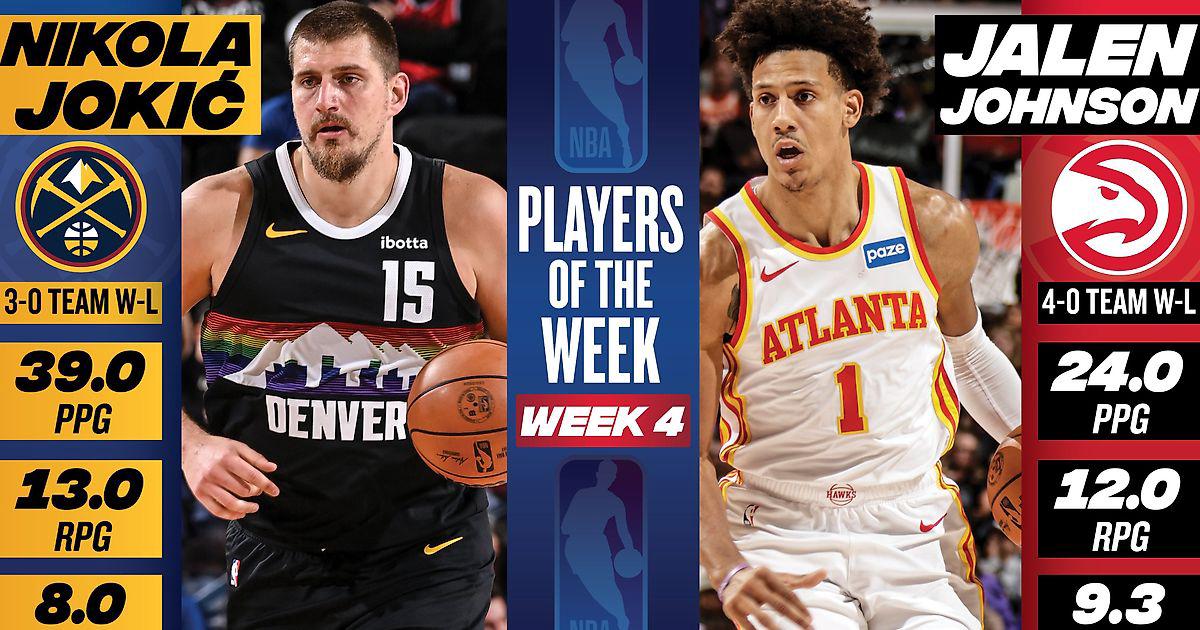 Центровой «Денвера» Никола Йокич и форвард «Атланты» Джейлен Джонсон названы лучшими игроками недели в Западной и Восточной конференциях НБА соответственно на 4-й неделе сезона-2025/26 (10–16 ноября).