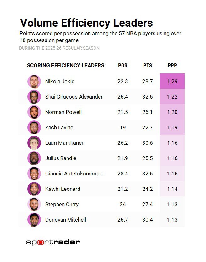 Центровой «Денвера» Никола Йокич, защитник «Оклахомы» Шэй Гилджес-Александер и защитник «Майами» Норман Пауэлл заняли топ-3 списка самых эффективных бомбардиров текущего сезона.