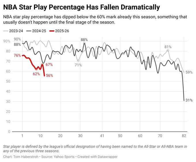 Почти половина всех топ-игроков лиги сейчас не может принимать участие в матчах. Процент участия звезд уже опустился ниже отметки 60%, что обычно наблюдается лишь на финальной стадии сезона.