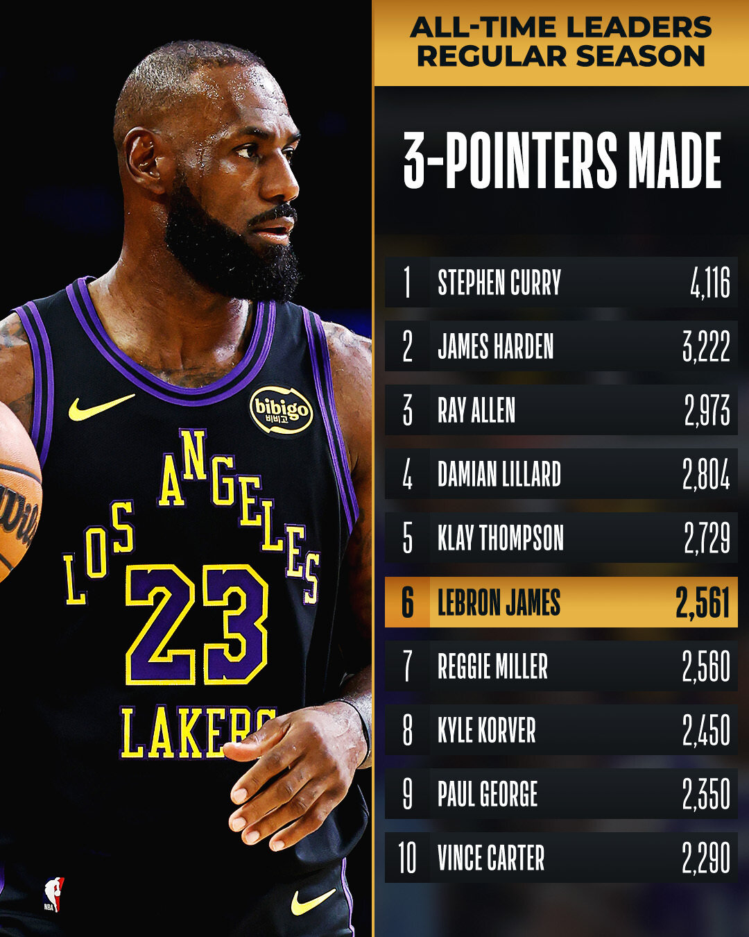 Леброн Джеймс вышел на 6-е место в истории НБА по количеству трехочковых (2561)