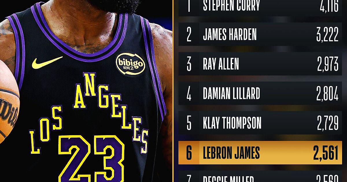В первом матче своего рекордного 23-го сезона Джеймс обошел Реджи Миллера (2560) по количеству трехочковых (2561).