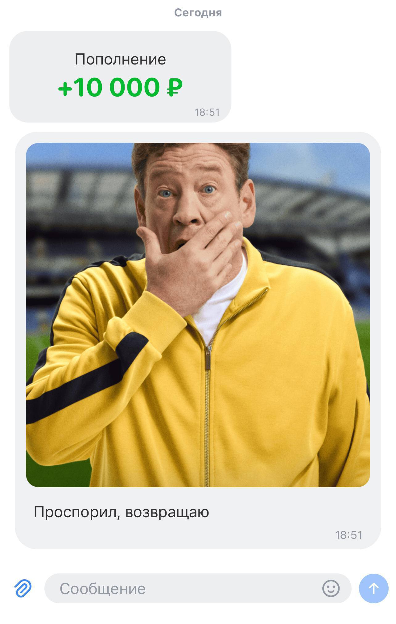 Ну вот, Дима проспорил и прислал грустного Слуцкого (он теперь выглядывает из открыток «Т-Банка»). А я ставил, что будет точный счет 1:0», – написал Генич в своем телеграм-канале, прикрепив скриншот денежного перевода.