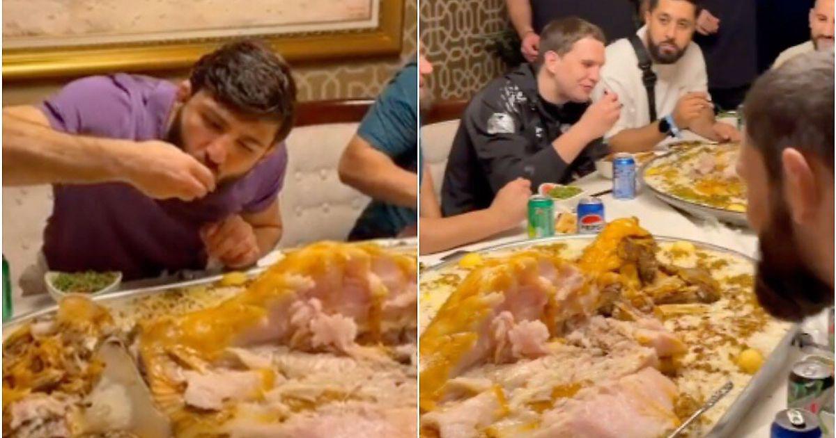 Боец UFC Арман Царукян вместе со своей командой и чемпионом среднего дивизиона Хамзатом Чимаевым попробовал блюдо из мяса верблюда в Катаре.