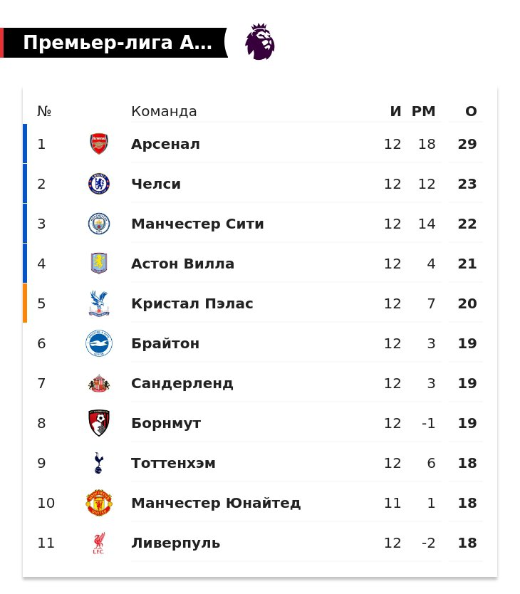 «Арсенал» лидирует в АПЛ после 12-го тура с 29 очками. «Челси» отстает на 6 баллов, «Ман Сити» – на 7, «Ливерпуль» – на 11