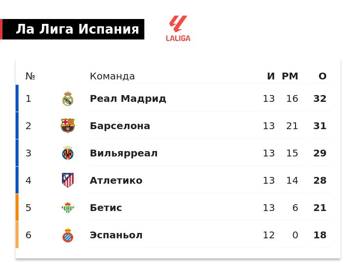 «Реал» лидирует в Ла Лиге с 32 очками после 13 туров. «Барселона» отстает на 1 балл, «Атлетико» – на 4