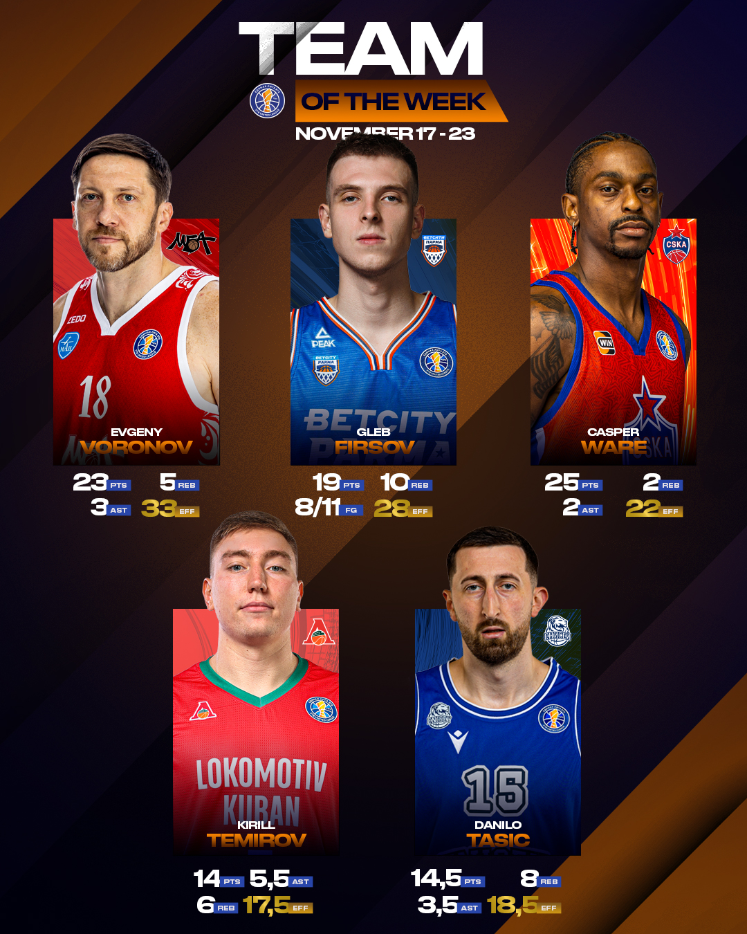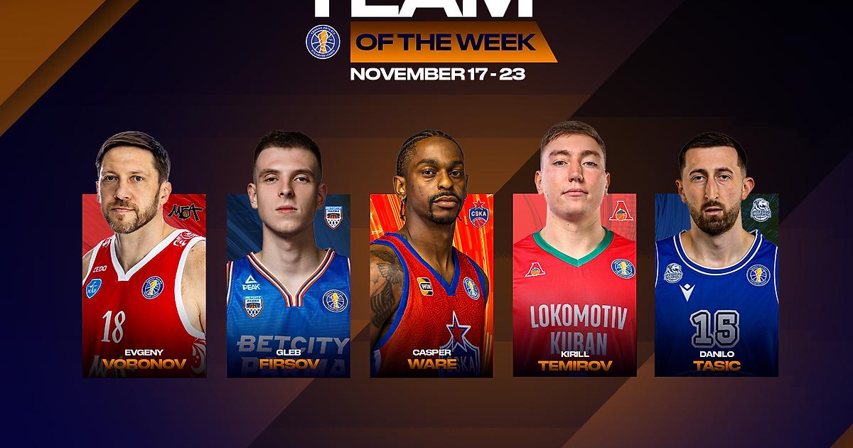 Единая лига ВТБ определила лучших игроков по итогам прошедшей игровой недели. По итогам матчей 17 – 23 ноября в символическую пятерку вошли разыгрывающий Каспер Уэйр (ЦСКА), атакующий защитник Евгений Воронов (МБА-МАИ), форварды Кирилл Темиров («Локомотив-Кубань») и Данило Тасич («Енисей»), а также центровой Глеб Фирсов («Бетсити Парма»).
