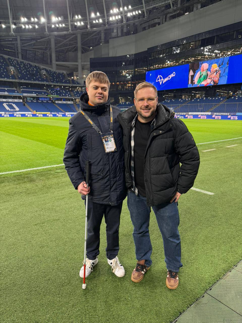 «У меня на комментаторской позиции сегодня особенный гость. Это Федор Замыцкий, незрячий болельщик, который написал текст с обращением к комментаторам, напомнив о том, что футбол не только смотрят, но и слушают.
