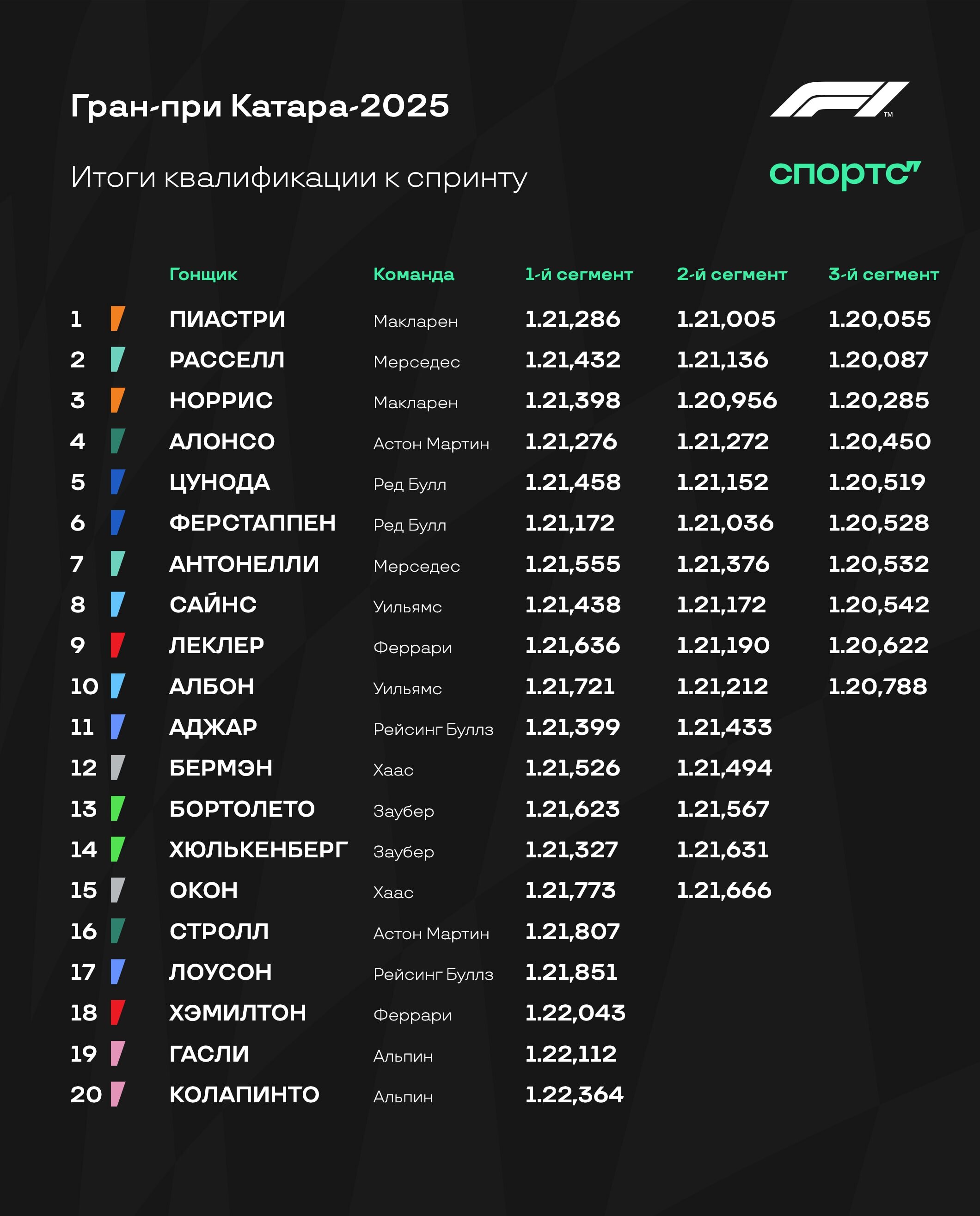 Гран-при Катара-2025. Пиастри выиграл квалификацию к спринту, Расселл – 2-й, Норрис – 3-й, Ферстаппен – 6-й