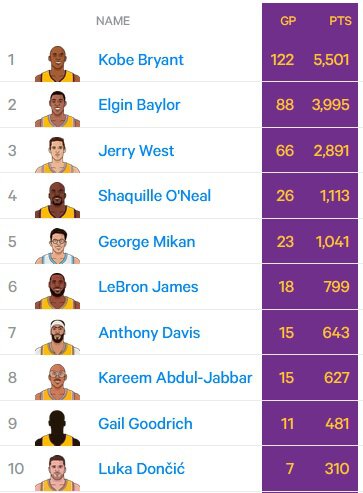 Список по количеству игр с 40 очками за «Лейкерс» и более: