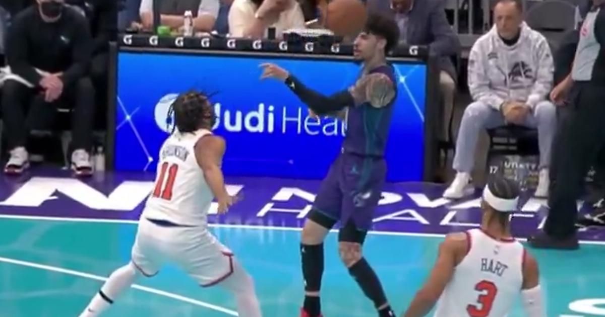 Разыгрывающий «Шарлотт» Ламело Болл попал коллеге по амплуа из «Нью-Йорка» Джейлену Брансону мячом в лицо с близкого расстояния, когда пытался отдать передачу не глядя.
