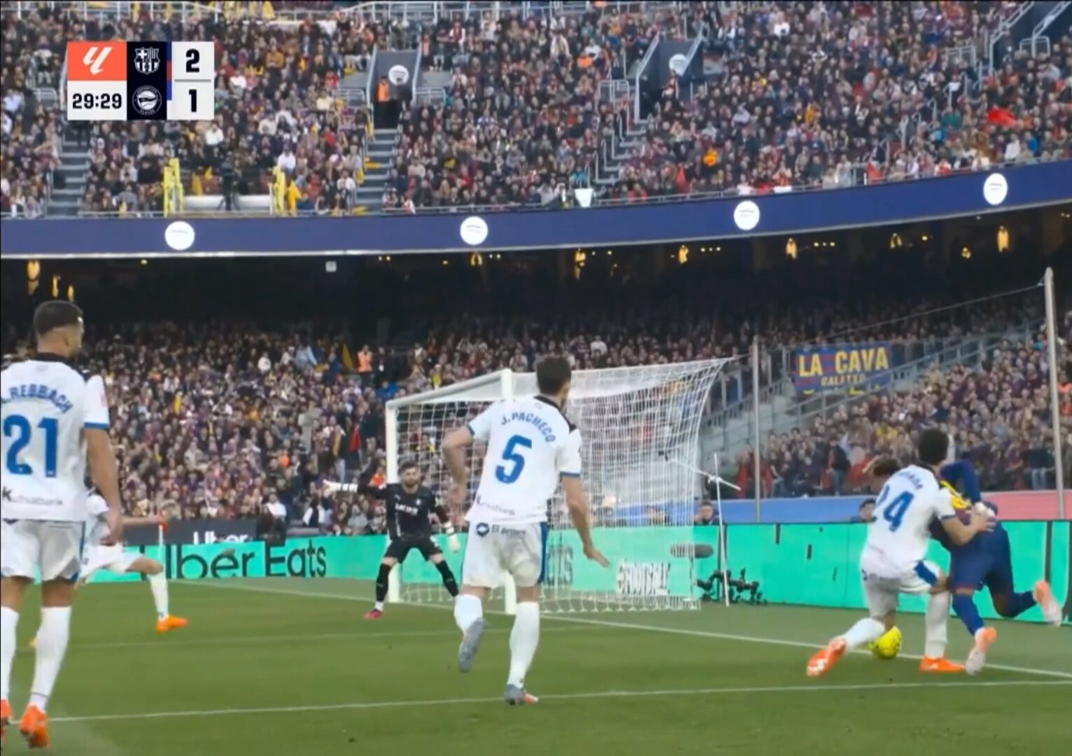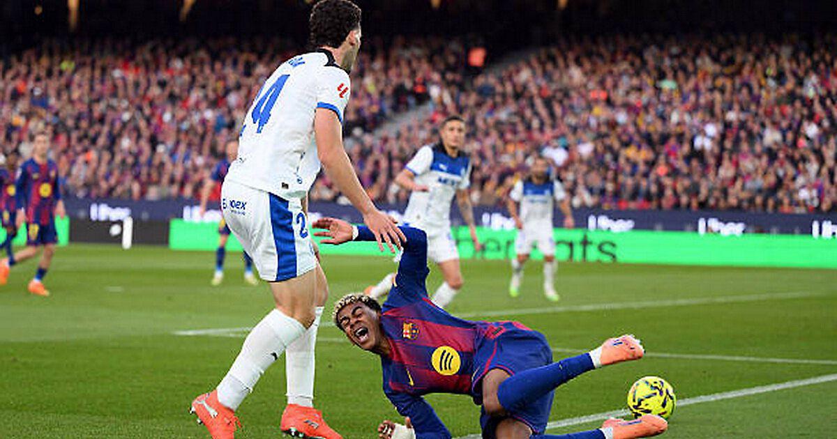 Ямаль упал в штрафной «Алавеса» после контакта с коленом Парады. Судья не дал «Барсе» пенальти