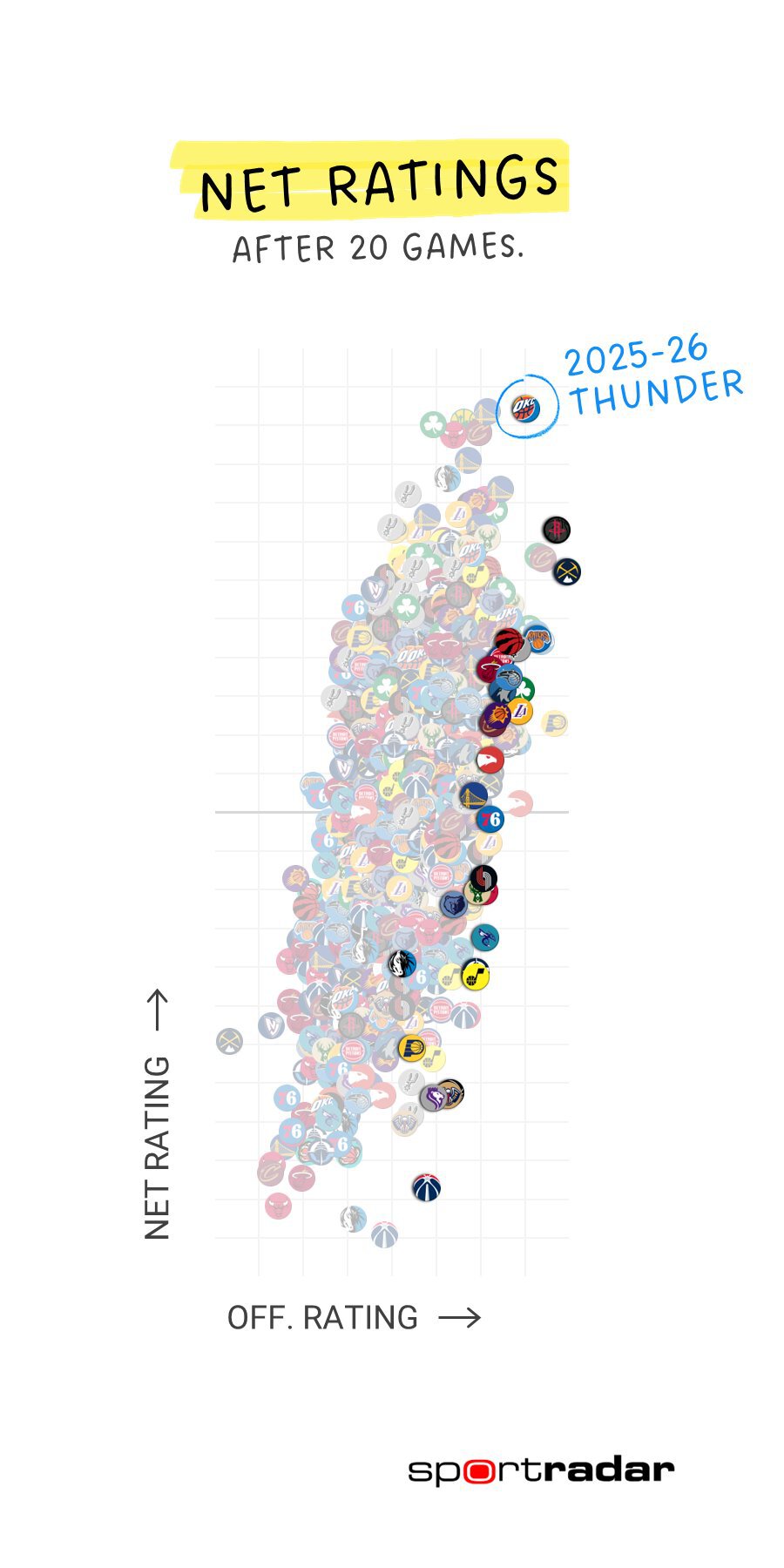 «Оклахома» выиграла 19 из 20 первых игр и занимает 4-е место по атакующему рейтингу (119,1) и 1-е по защитному (103,4). Разница в 15,7 очков на 100 владений выводит их на первое место в истории на этом отрезке «регулярки».